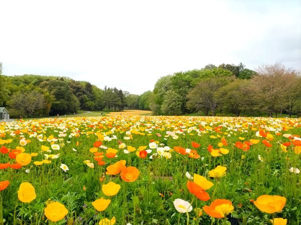 公園の南口から徒歩約20分の運動広場花畑では、約70万本の『アイスランドポピー』が最盛期を迎えています。驚くことに、目に見える遠くの先までポピーの花畑が続いています。東京ドーム65個分もの広さを誇る森林公園ならではの、圧巻の景色!