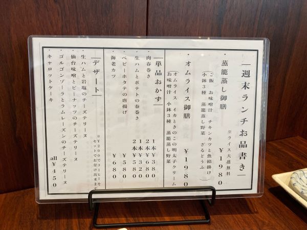 土・日・祝日は週末ランチメニューで、蒸籠蒸し御膳とオムライス御膳の2種類です。