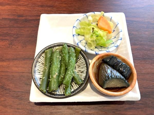 小鉢3種はいんげんの胡麻和え、ナスの揚げ浸し、自家製の漬物でした。