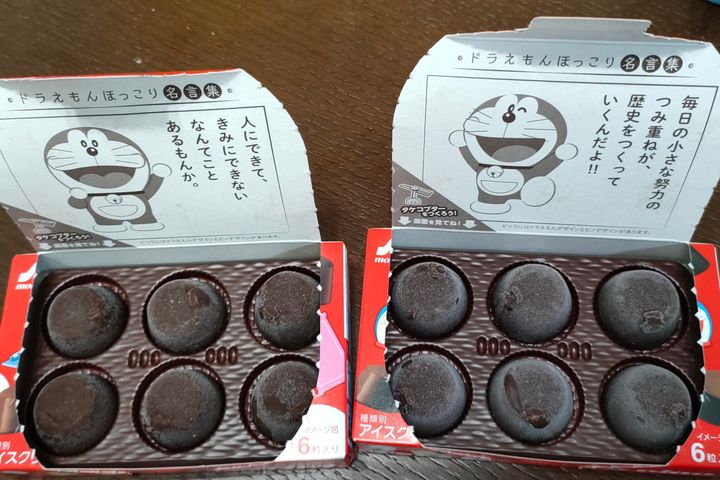 引っ越し、入学後のバタバタの新生活で疲れた時に、ピノを開けると、蓋の裏側のドラえもんの名言集があって、慈悲深いお言葉に癒やされた母でした。