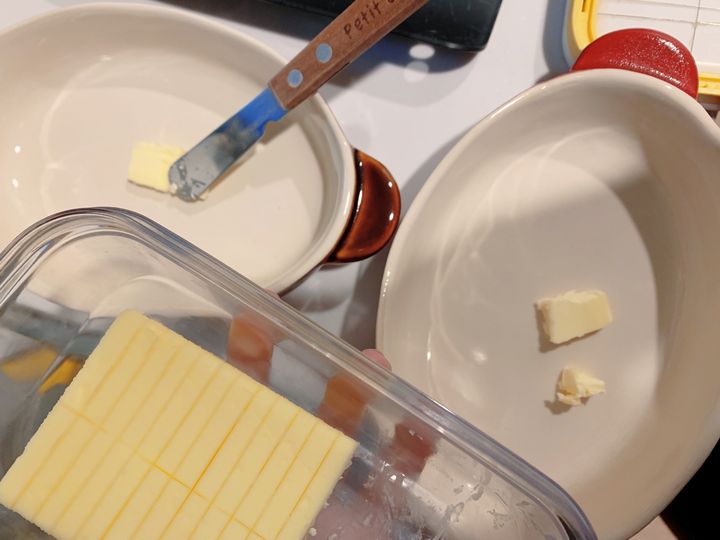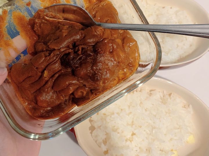 バターを塗ったグラタン皿にご飯を盛り付けて残ったカレーを上に被せる!