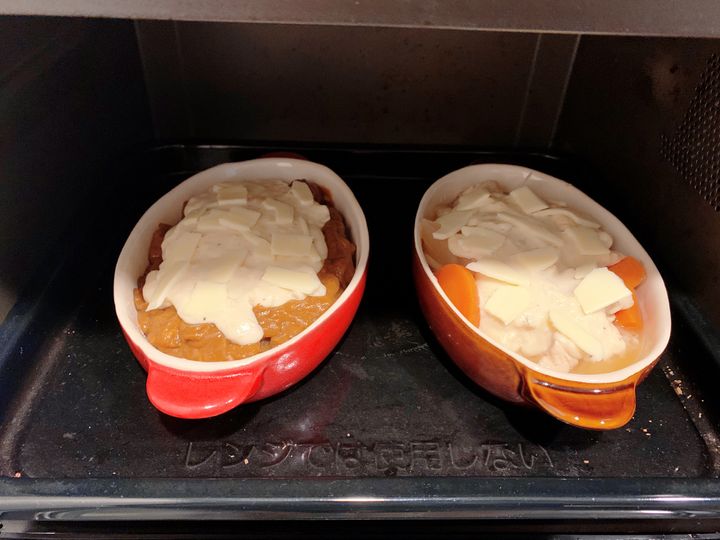 全ての盛り付けが終わったら電子レンジのオーブンで250℃予熱なしで約15分。