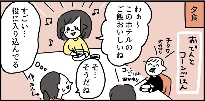 その豊かな妄想力というのか、想像力というのか…「おでんを食べる」「テレビを見る」などやってることは普段とそこまで変わらないことでも、「今自分はホテルにいるんだ!」という気持ち一つであっという間に日常を非日常に変えてしまうのを目の当たりにし、すごいなぁと思いました。