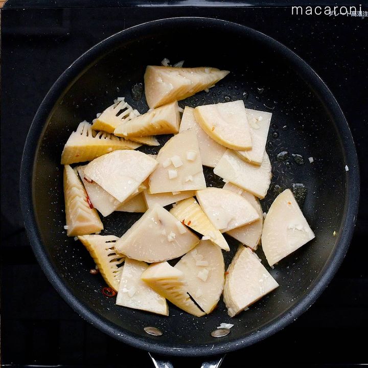 2: フライパンにオリーブオイルを引いて熱し、にんにくと唐辛子を入れて炒めます。香りが立ってきたらたけのこを入れて中火で炒め、酒、塩で味を調えます。