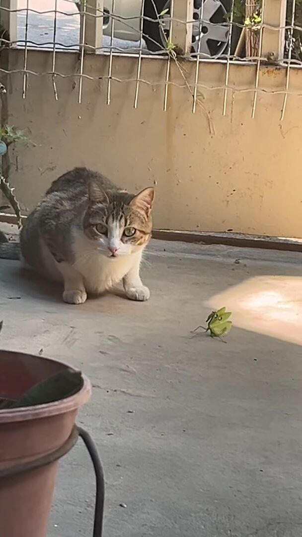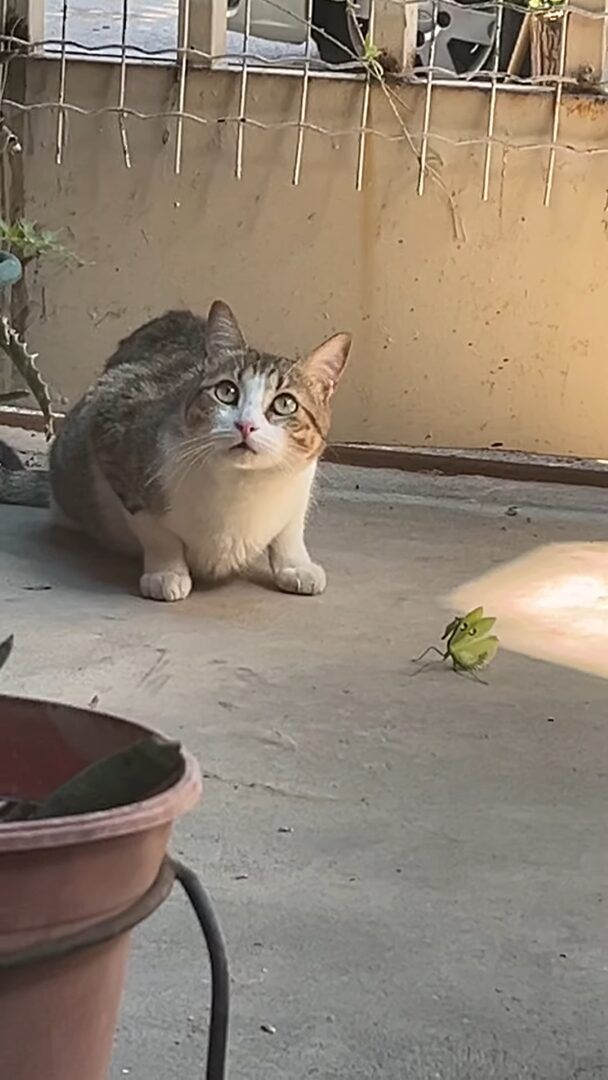 もしかして、カマキリは猫に立ち向かうつもりなのでしょうか?