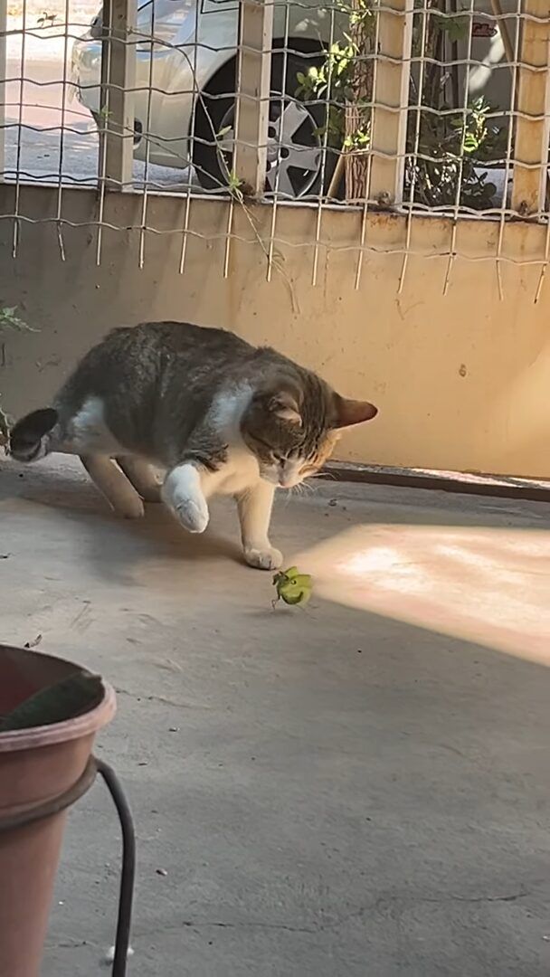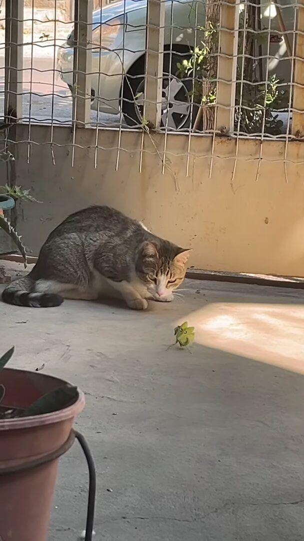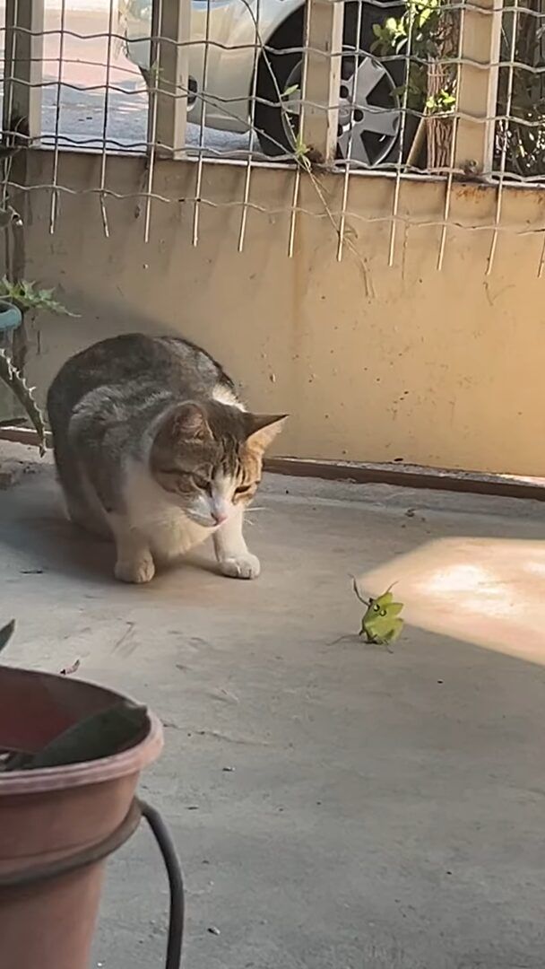 カマキリは、体格差のある猫相手に怯むことなく戦いを挑むなんて恐れ知らずですね!!