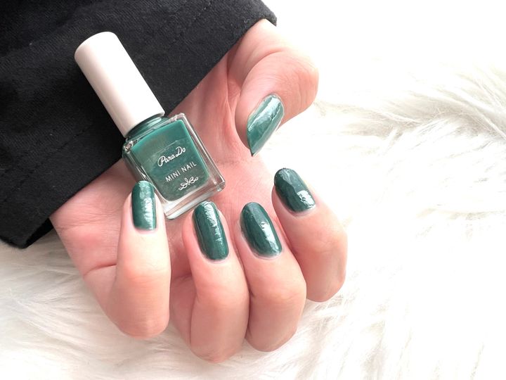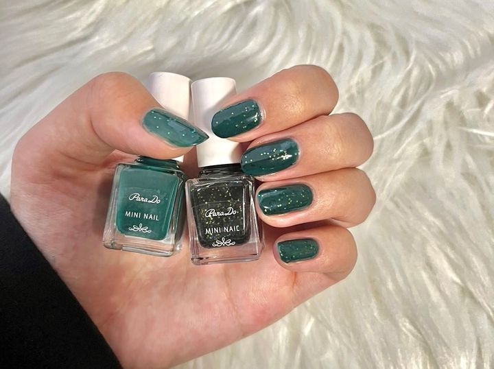 シンプルな深みグリーンにブラックベースの大きめのラメで更に奥深くなるような。