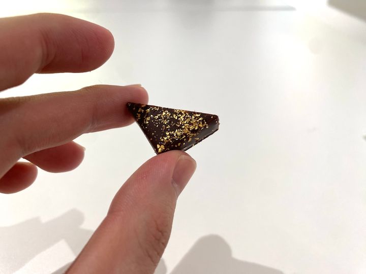 プラリネ仕立てにしたイベリコ豚の生ハムが入ったショコラ。チョコレートの甘みと生ハムの塩味、うま味が噛むたびに溶け出してきます。また、クルミが入っているため食感も楽しく、「ピアマンデスペレット」というフランス・バスク地方特産の香辛料がアクセントとなっていて、ショコラ全体の味のまとまりのよさが魅力です。