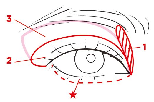 3のグリッターベージュを眉下まで広く入れ、2のマットベージュを二重幅にON(実際の目尻より先まで)。さらに★の茶を下まぶたに塗ったら、1を目頭から眉に繋がるように入れて陰影づけを。