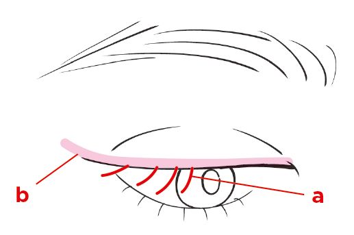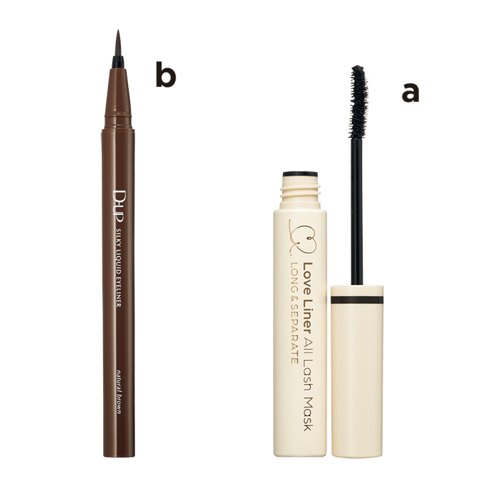 伏し目にして、上の目のキワにbのダークブラウンで細いラインを引く。実際の目尻よりも少し長めに入れるのがポイント。上まつ毛にはaを。根元にはたっぷり、毛先には軽く塗るようにして。
