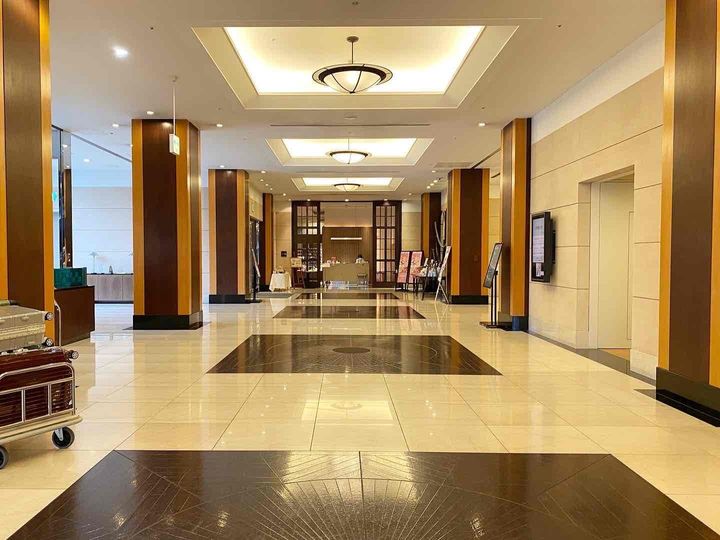 ホテル1階、ラグジュアリーな廊下の先にアフタヌーンティーの会場となる「欧風レストラン ユーロカフェ・エヴー」があります。