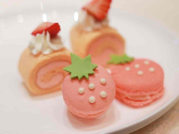 たくさんのかわいいスイーツの中でも、私はとくにいちごのマカロンがかわいさと美味しさのバランスがよくて気に入りました!
