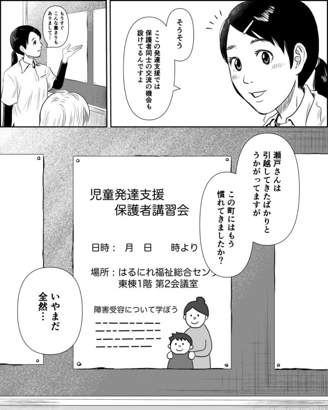 バスを降り、タクシーに乗ってやってきた、はるにれ総合福祉センターのこども発達支援に向かったあやこさん、そこでやりとりしているママさん達や遊んでいる子ども達を眺めながら、ゆみかちゃんと周りの子ども達との差を感じて胸が痛くなり・・