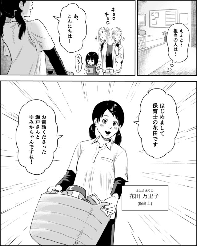 「はじめまして!保育士の花田です。お電話くださった瀬戸さんとゆみかちゃんですね!」