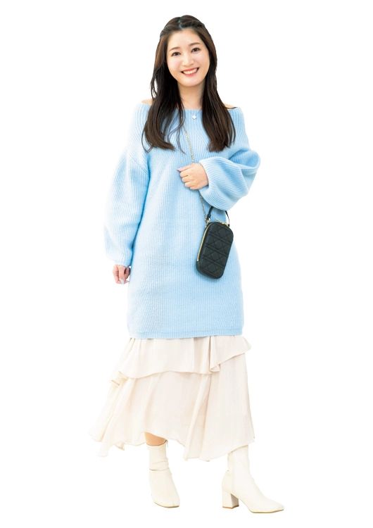 「さりげない肌見せ感がお気に入りのオフショルニットは水色を選んで清潔感をプラス。やさしい雰囲気になるように、全体をふんわりとした色みや質感でまとめました。シルエットがきれいで高見えするGUのブーツは歩きやすさも抜群!スカートの色とマッチさせれば、脚長効果も狙えます」(学校事務/長澤友理恵さん・31歳)