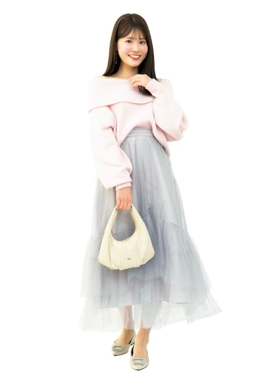 「FRAY.IDで見つけた桜ピンクのニットを主役にして、気持ちも華やぐ甘コーデに。同じ淡いトーンのチュールスカートを合わせることで、全体の統一感とボリューム感を調整!オフショルのさりげない肌見せ効果で、軽やかな印象にまとめてみました」(企業受付/西沙也加さん・28歳)