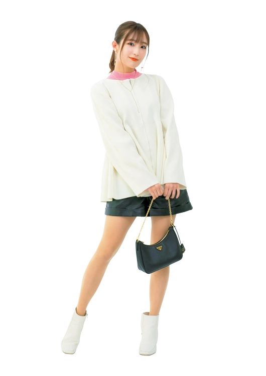 「可愛らしさのあるアウターに、レザーのショートパンツを合わせてコーデを辛口にシフト。ペプラムシルエットが女性らしさを演出してくれます。インナーにパッと目を引くピンクを取り入れて春らしく、コーデに彩りを添えました」(エステティシャン/吉田明加さん・29歳)