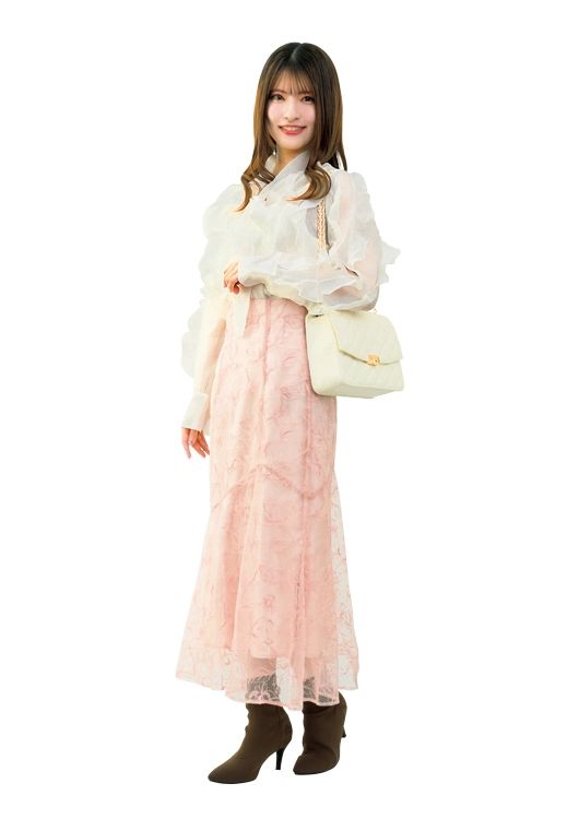 「ジルスチュアートのマーメイドスカートは、デートにも通勤にもぴったり!ボリューム感のあるブラウスをINしてウエストまわりを引き締め、〝ふわきゅっふわ〟のシルエットを重視しました。フリルブラウスならコーデの華やかさもアップしてくれます♡」(会社人事/木村咲彩さん・28歳)