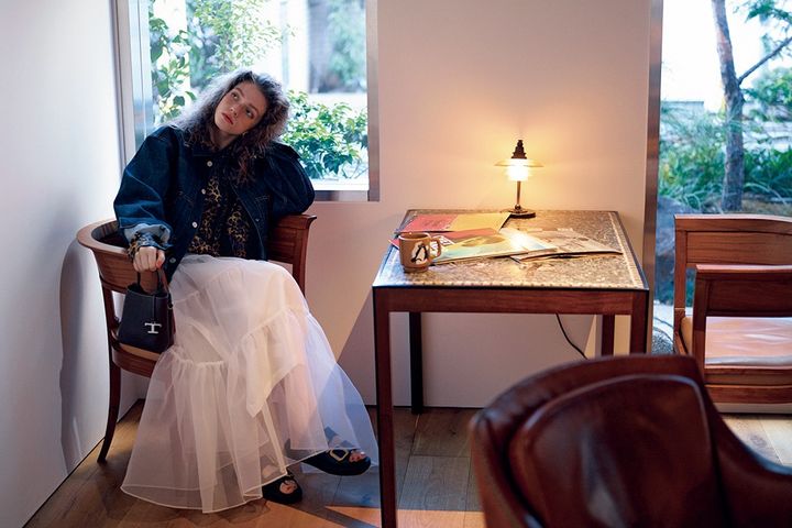 白ボリュームスカート 39,600円/ウィム ガゼット(ウィム ガゼット ルミネ新宿店) レオパード柄パーカ 48,180円/Oblada(シンチ) インディゴデニムジャケット 45,100円/カオス(カオス丸の内) ゴールドイヤリング 12,600円/アビステ 茶バッグ(別注) 152,900円/トッズ(RHC ロンハーマン) サンダル(別注) 108,900円/トッズ(ロンハーマン)