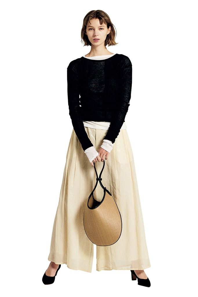 透ける素材のレイヤードトップスとの組み合わせ。透け素材どうしの組み合わせは、全体をやわらかな印象に仕上げてくれる。ミニマルに徹したことで、パンツの素材感やシルエット、雰囲気などの美点が前面に引き出された形に。