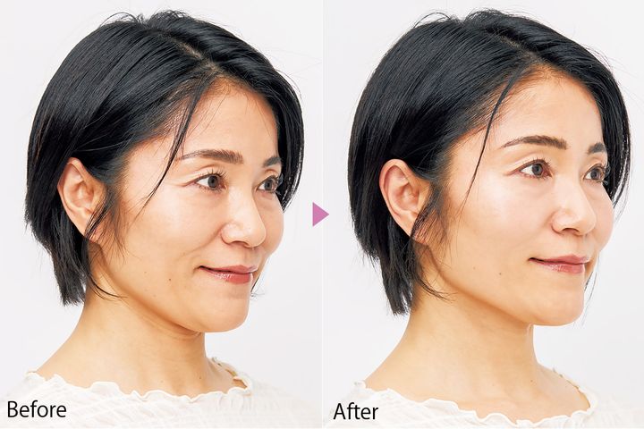 眼の下のたるみ部分がなめらかになってあご下のたるみもきゅっと引き締まった印象に。口まわりのシワも浅くなり、顔色もワントーン明るく、透明感もアップ。
