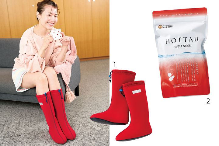 1:家事やリビングで寛ぎながら足湯ができ、足元からポカポカに。重炭酸足湯ブーツ M ¥9,790、2:温浴効果で血流を促進し、入浴すると体温もアップ。追い焚きしても24時間濃度が持続します。薬用 HOT TAB WELLNESS[医薬部外品]45錠¥3,960(ともにホットタブ)