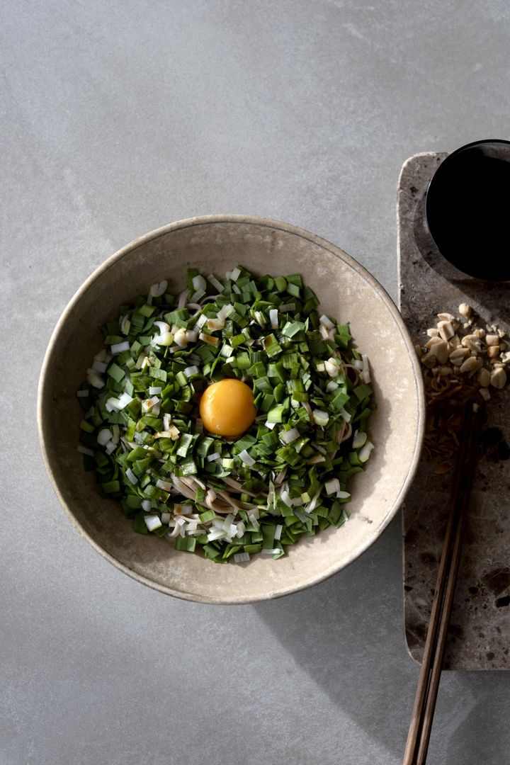 「NÃMEN そば×ラー油&香醋ドレッシング風つゆ」、ニラ、ネギ、豚ひき肉または牛ひき肉をあえて、卵黄をトッピング。