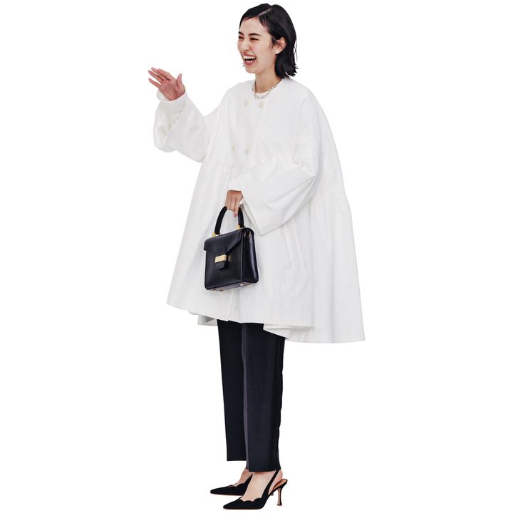 ミドル丈アウターは一見着ぶくれしそうですが、ふわっと広がった甘いデザインを選ぶことで絶妙なバランスにまとまり、スタイルアップが叶う優れもの。ベーシックカラーがキレイめコーデに使いやすそうです。