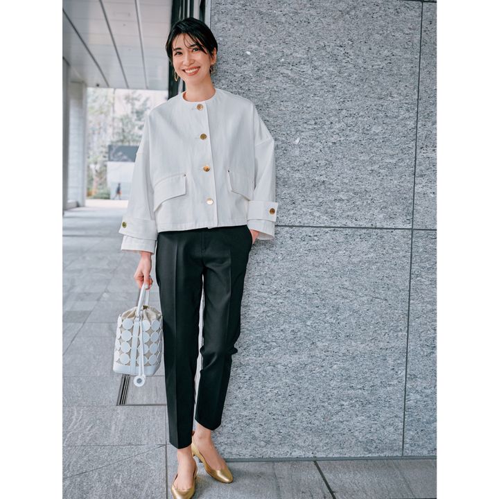 ノーカラー×金ボタンのジャケット なら肩ひじ張らずよそ行きに