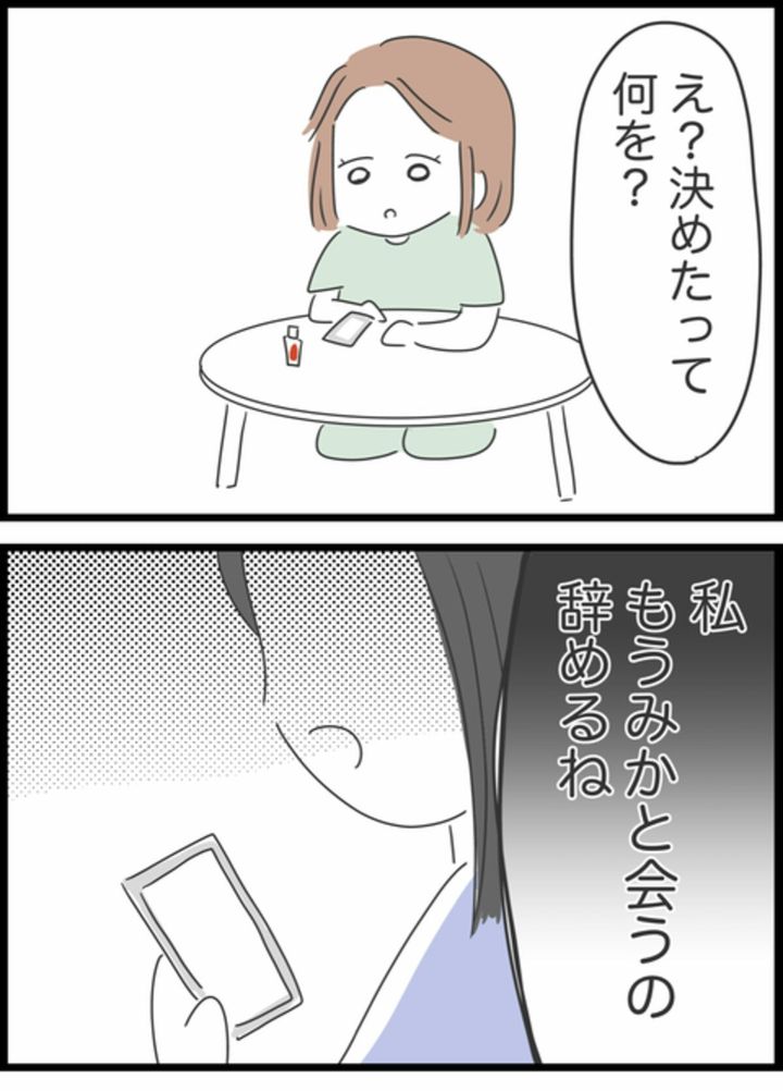 ゆうこに我慢を強いていたことを想像もしていなかったみかにとって、ゆうこの絶縁宣言は青天の霹靂だったのかもしれません。しかし、たくさん悩んで出したゆうこの決意が揺らぐことはありませんでした。