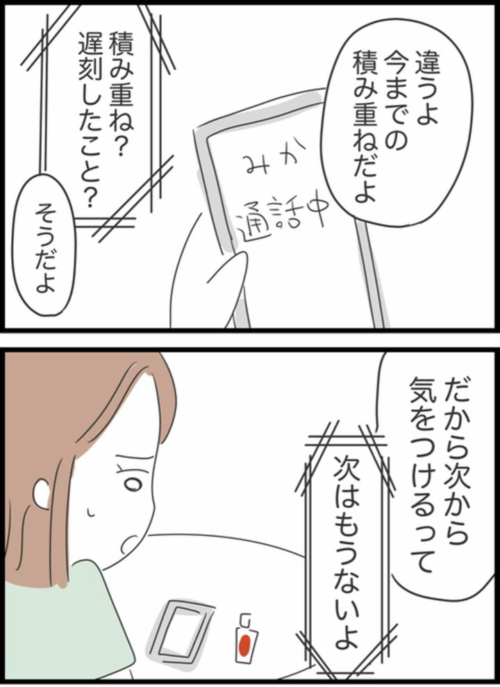 遅刻癖のある友人・みかにモヤモヤしながらも、毎回我慢して許していたゆうこ。何度も注意をしてきましたが、反省の色が見えないみかに我慢の限界を迎えます。積もり積もった気持ちを伝えるものの、価値観の違いから全く伝わらず、結局友人関係を絶つことに。