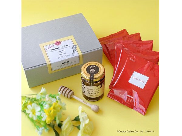 母の日をイメージした圧倒的な華やかさが特徴のパナマ産ゲイシャ種とエチオピア産モカイルガチェフェの最高等級豆※1をブレンドした数量限定ドリップカフェと、100%国産はちみつを使用した「コーヒー豆を浸して作ったはちみつ※2」、オリジナルはちみつサーバーをセットにした、香りと甘さにほっと癒されるオンラインショップ限定のギフトセットです。