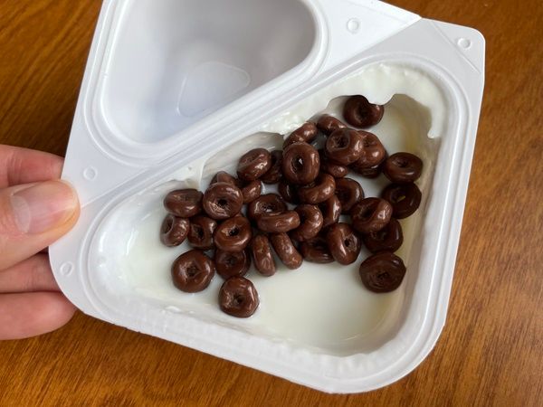 そしてチョコリングはサクサク食感。ヨーグルトと一緒に食べると、サクサクのチョコリングとなめらかなヨーグルトがマッチしてこれまたすごく美味しい。