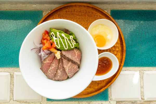 石垣港離島ターミナルから車で約8分、歩いて約30分、海が見えるおしゃれなカフェ「ナチュラルガーデンカフェ プカプカ」。1日10食限定の「美崎牛のローストビーフボウル」は、柔らかくて分厚いローストビーフが魅惑的。トッピングは玉ねぎソースと生卵です。