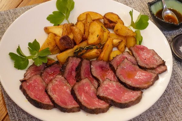 1ポンド(450g)16,000円で、1/2ポンド(225g)8,800円、和牛のステーキとフライドポテト、ソースが付いてきます。