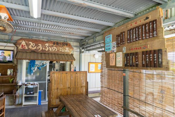 石垣港離島ターミナルから車で約9分、徒歩約30分、さとうきび畑のど真ん中にある「とうふの比嘉」。こちらはランチスポットではなく朝食スポットになります。「ゆりかしセット」は、ゆし豆腐と玉子焼き、おからの味噌炒め、ごはんorおかゆのセット。