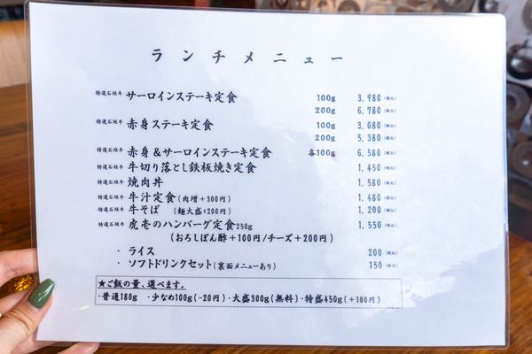 石垣牛のステーキや鉄板焼など、ランチメニューも豊富です。店内はテーブル席、お座敷、カウンター席があり、どの席もパーテーションで区切られているので、くつろいで食事ができます。おひとりさまでも入りやすいのがうれしいですね。