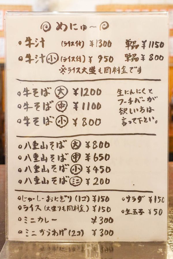 牛汁、牛そば、八重山そば、タコライス、じゅーしーおにぎりなど沖縄らしいメニューはもちろん、カレーやとんかつ定食、豚みそ炒め定食といった食堂らしいメニューもあり。店内はカウンター席・テーブル席・お座席があります。家族でも、一人でも行きやすいお店です。