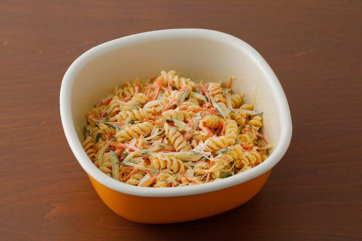 きゅうりは、2~3等分(マカロニと同じくらいの長さ)にして千切りにする。千切りキャベツをざるに入れて、水をチョロチョロ流しておく。水を切って、同じざるの中にきゅうりの千切りを混ぜながら入れる。人参は皮をむいて、2~3等分(マカロニと同じくらいの長さ)にして千切りにする。