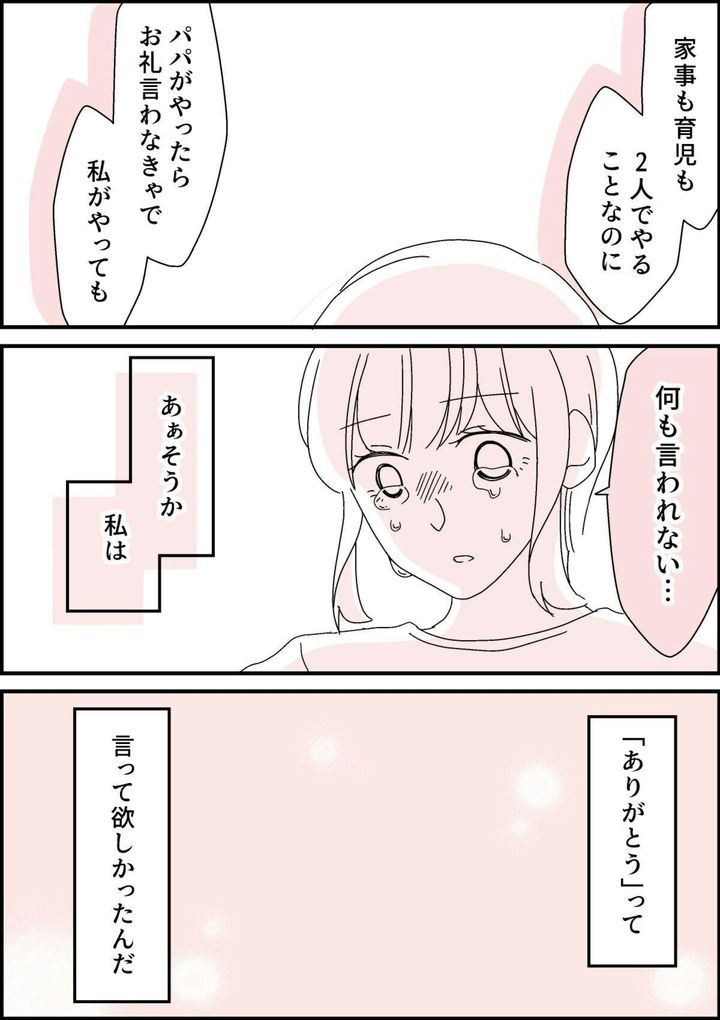 自分が家事をやっていることが当たり前になり、感謝の言葉がなくなってしまったことに寂しさを覚えるまことさん。しかし、それは自分も同じなのではないかと気が付きます。