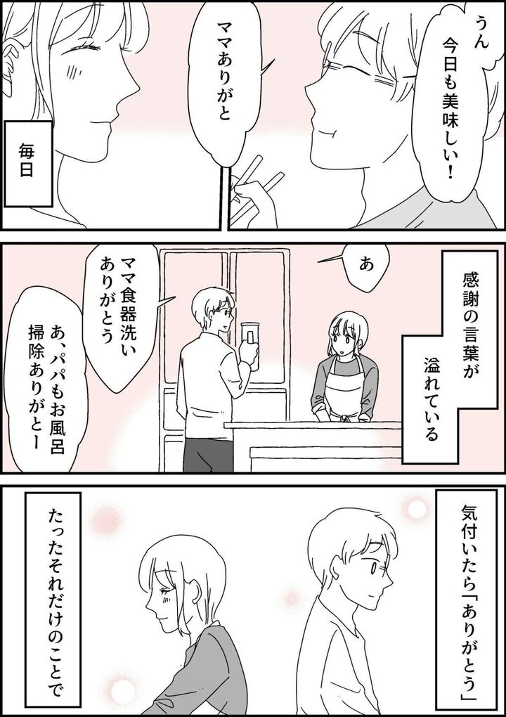 「ありがとう」という簡単な言葉。しかし、家族として月日を重ねることにその言葉が減ってしまっていたことに、まことさんと夫は気が付きます。
