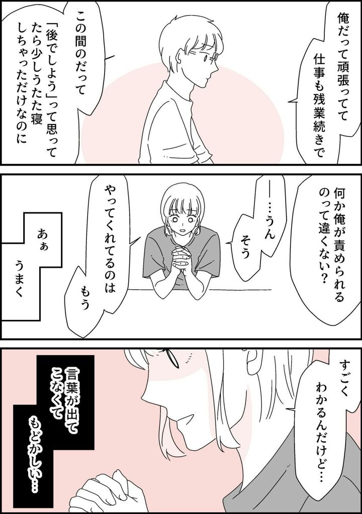 夫にモヤモヤを伝えると、夫は自分なりにできることをしているのに責められていると感じてしまったようです。まことさんは自分が何に対してモヤモヤしていて、夫にどうしてほしいのかをうまく言葉にできませんでした。