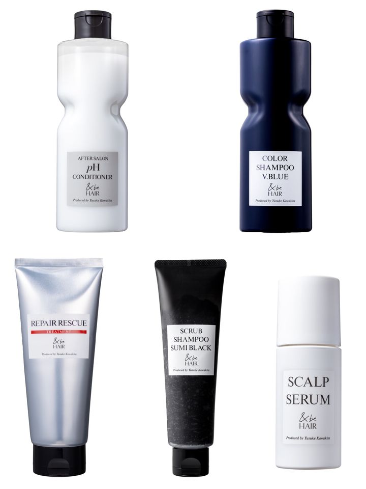 ▲左上:&be アフターサロンpHコンディショナー 280ml ¥1,650(税込)、右上:&be カラーシャンプーVブルー 280ml ¥1,980(税込)、左下:&be リペアレスキュートリートメント 200g ¥1,540(税込)、下中:&be スクラブシャンプースミブラック 150g ¥1,980(税込)、右下:&be スカルプセラム 60ml ¥2,750(税込)