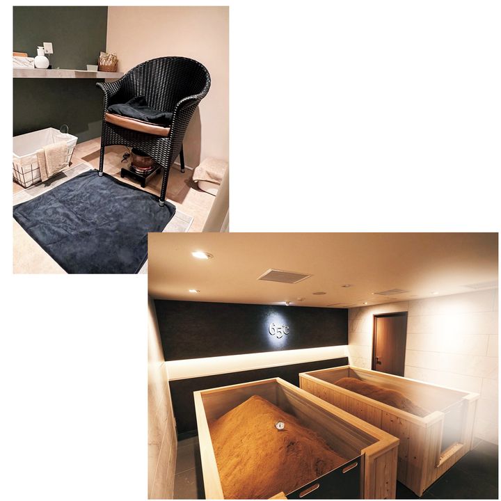 右:入った後は見て分かるほどむくみが解消。清潔でオーナーのこだわりが詰まった酵素浴は唯一無二。豊富なデトックスメニューも。