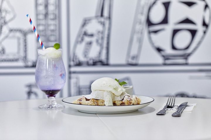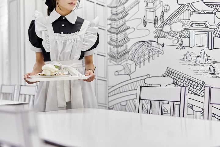 さて、2Dアートのインテリアでの撮影を存分に楽しんだら、お待ちかねのスイーツです。こちら店員さんの衣装も白黒のメイド服。かわいすぎます。