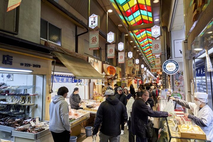 観光客に絶大な人気を誇る、京都の錦市場商店街。鶏卵屋さん、昆布屋さんなど、京都の昔ながらの暮らしを思わせる専門的な小売店が立ち並びます。