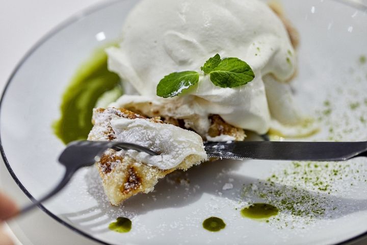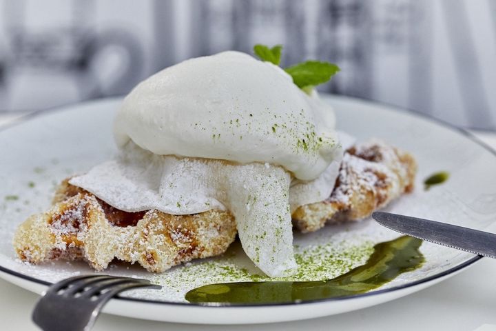 注文したのは、「抹茶もちクリーム」1600円。京都っぽさも感じられるプレミアムクロッフルです。「クロッフル」とは文字どおりクロワッサンとワッフルのハーフ。さまざまな新しいスイーツを生み出しては話題をさらう韓国スイーツのひとつです。