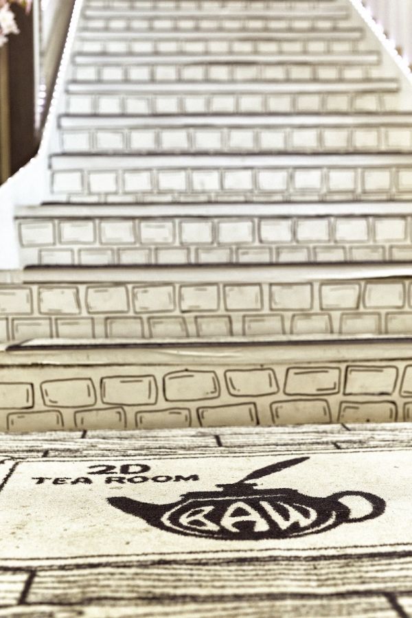 扉を開いた先にあるのは、白と黒の2Dと3Dが混じり合った不思議な世界。遠くから見ると、形あるテーブルや照明まですべてが絵のように感じてしまうから不思議。