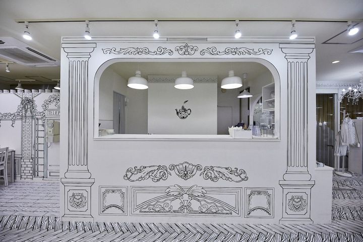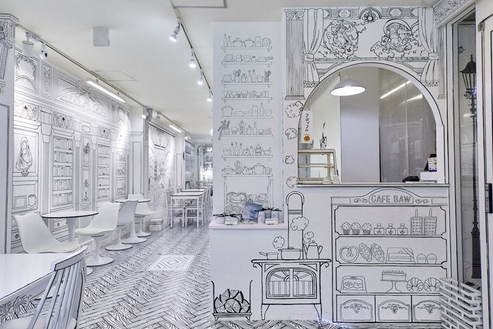 店内に入った瞬間、異世界に足を踏み入れたような不思議な感覚に包まれる「2D TEAROOM BAW(つーでぃ てぃー るーむ ばう)」。店内全体が黒と白の線で構成された京都初の2Dアートカフェです。