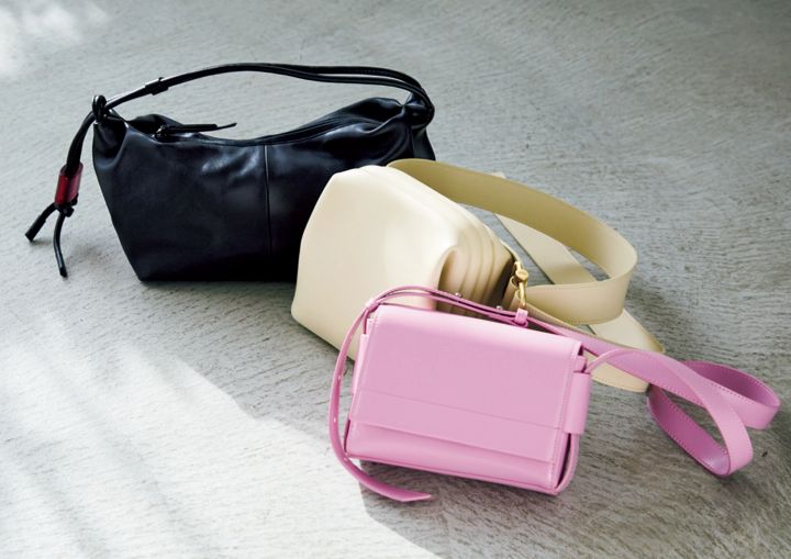 奥から・やわらかなソフトレザーを採用し、シンプルながらもクラシックなアイテムが揃う。バッグ¥35,200/アーカイブエプク(UTSPR) 感度の高いファッショニスタを中心に人気を集めるブランド。バッグ¥46,200/オソイ カラーバリエーションも豊富で、ジェンダーレスで使えるバッグも多数。バッグ¥13,900/スクエアライン(ハナ)